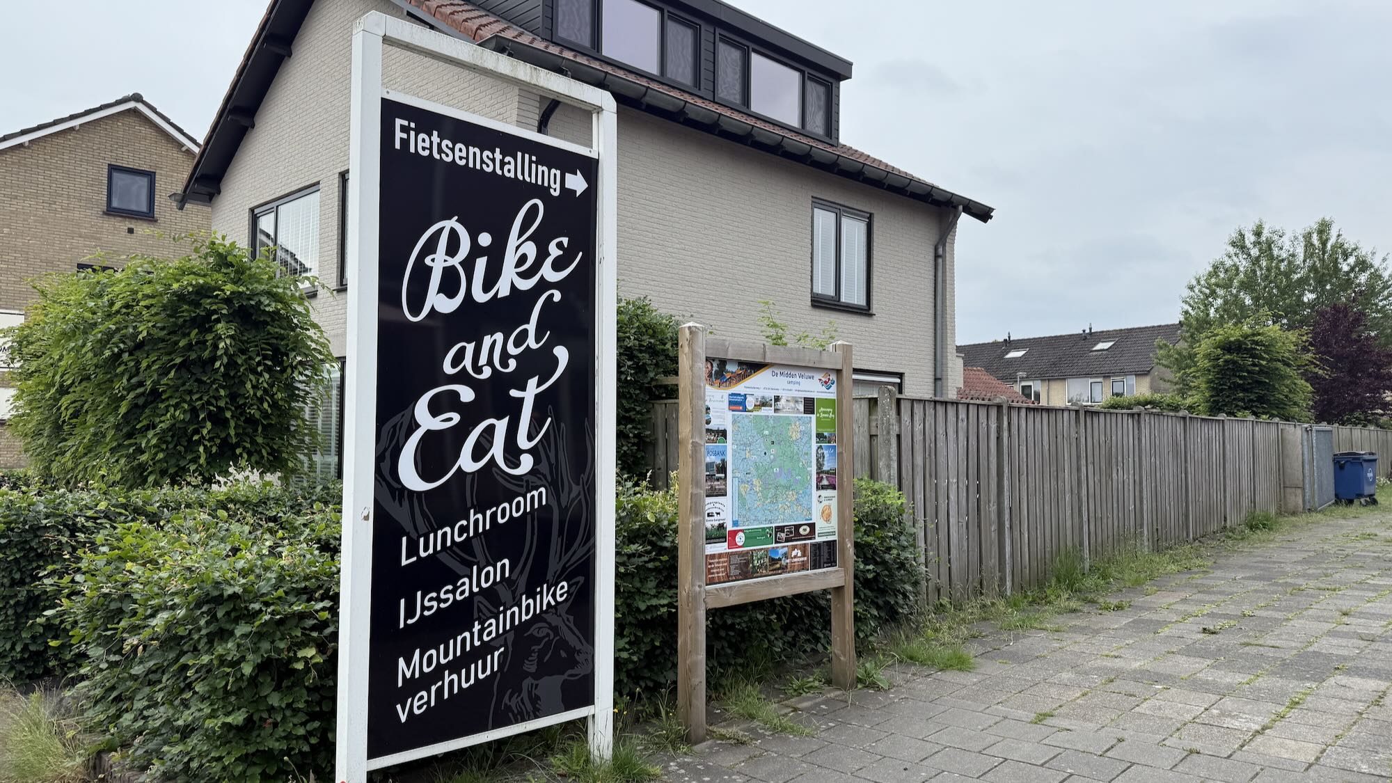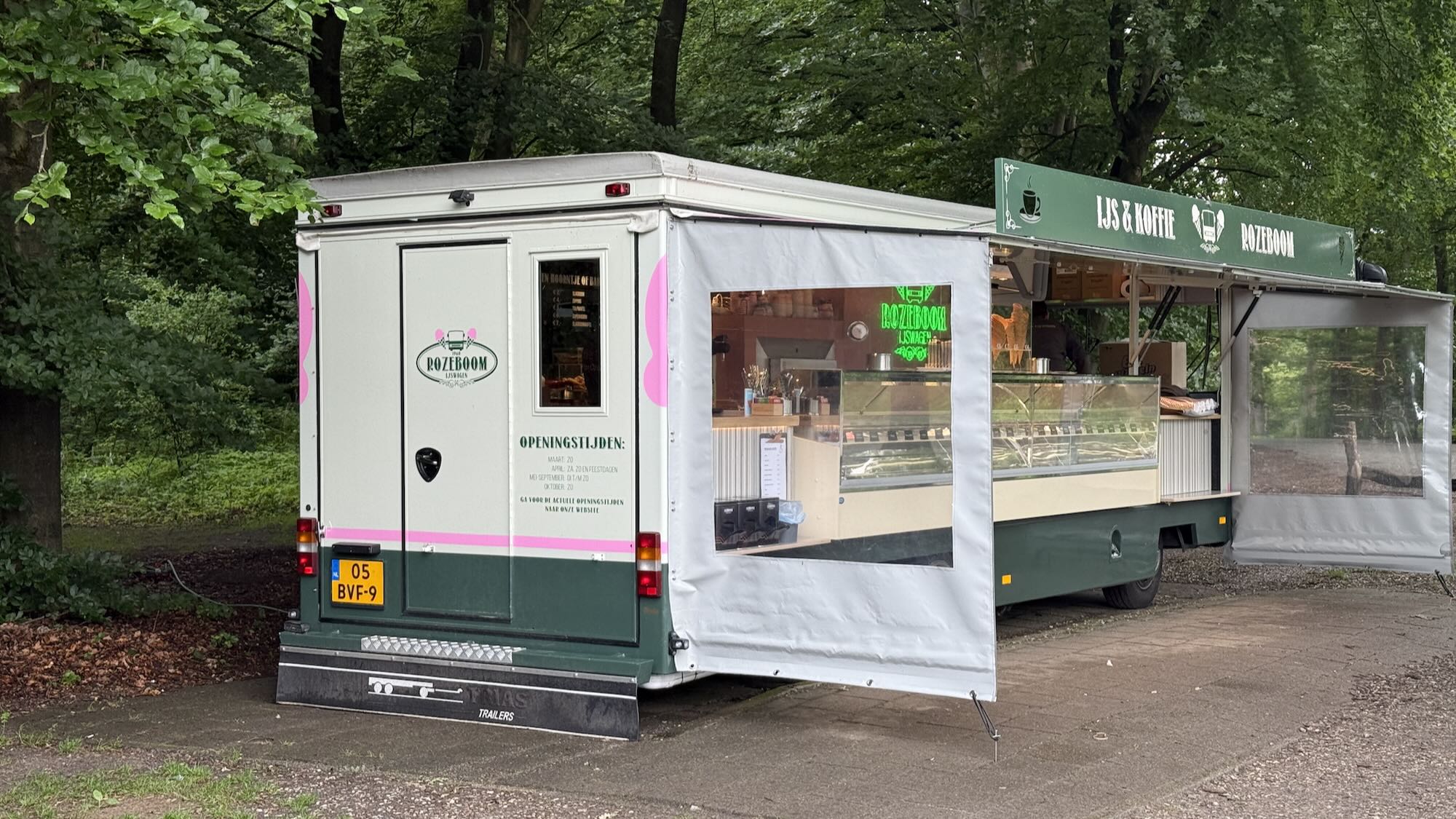 Ein Parkplatz am Waldrand und ein Verkaufswagen mit „IJS & Koffie“ Ein Eis und Kaffee ist doch klar.