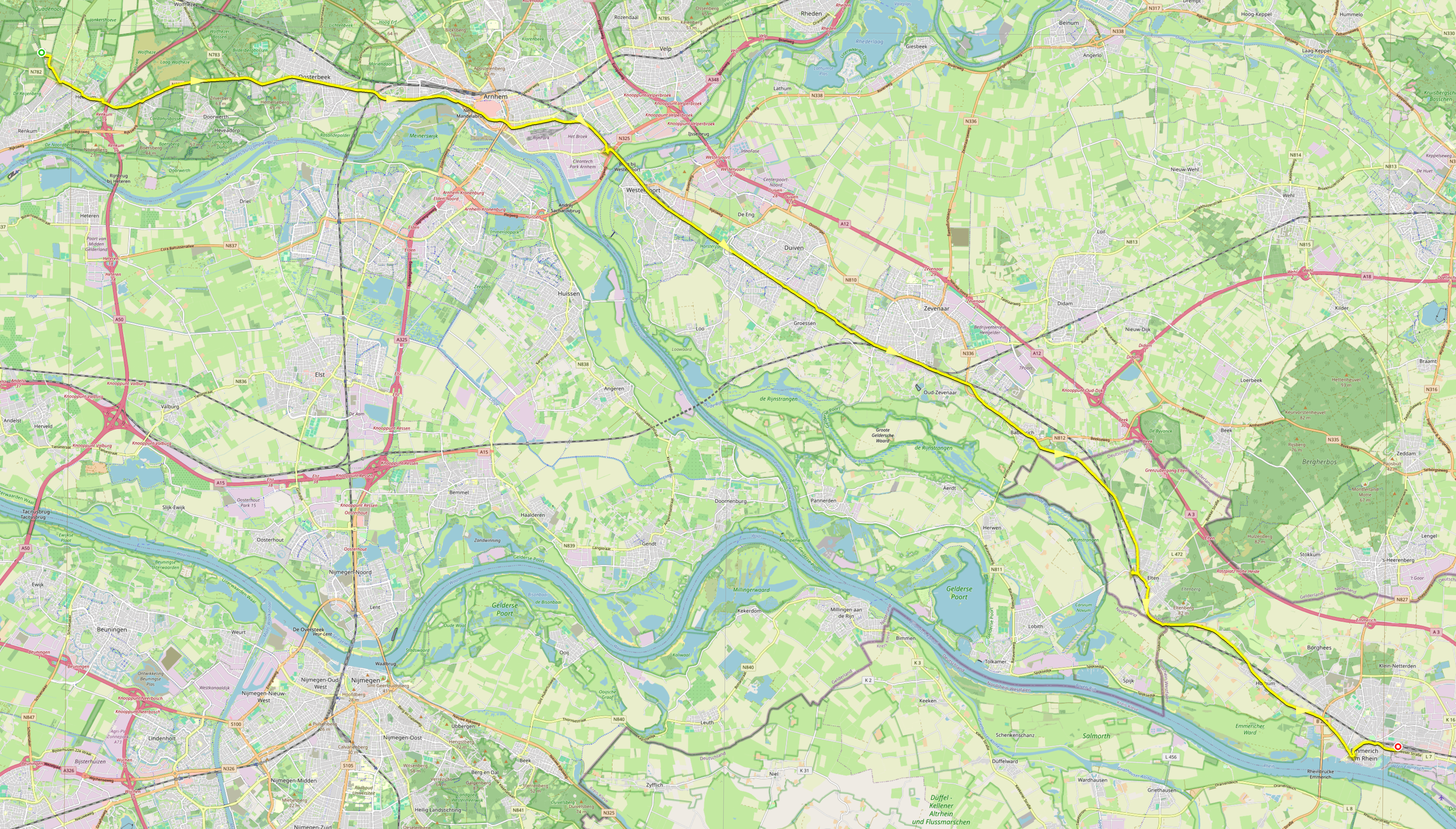 Strecke zum Bahnhof Elten, 36 Kilometer, kurz hinter der Grenze war