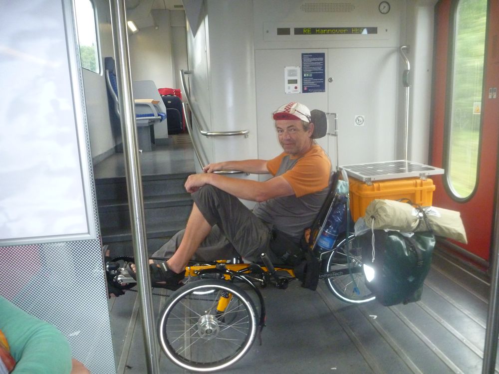 ![]() | Um 14.30 Uhr erreichen wir Leer. Erst um 15.42 Uhr geht unser Zug in Richtung Bremen. Beim Türken um die Ecke essen wir zu Mittag. Als wir auf dem Bahnsteig stehen und auf den Zug warten, kommen immer mehr Radfahrer dazu. Einige von Ihnen sind unangenehme Zeitgenossen. Ich habe das dumme Gefühl, das sie einer bestimmten Berufsgruppe zuzuordnen sind. Sie haben schon Angst, das sie keinen Platz mehr im Zug bekommen, weil ich mit meinem Gespann doch viel Platz in Anspruch nehme. Der Zug hat mehrere Radabteile und diese Gruppe setzt sich ab von uns und angenehme Radfahrer teilen sich mit uns ein Radabteil. Es ist eng aber gemütlich. Ich habe den Vorteil, das ich mein Trike als Sitzplatz habe und stehe quer im Zug. In Bremen Hauptbahnhof steigen/rollen wir aus und mein Trike wird mit Hilfe zweier Bahnbeamten nach unten getragen. Der letzte Rest geht reibungslos vonstatten. | |
