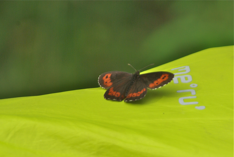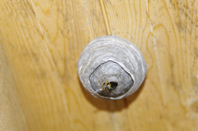 | Wie biegen ab und der Weg wird wohl irgendwo enden. Wir bleiben hier. Ein großer Platz und eine Holzhütte mit Sitzmöglichkeit. | Über meinem Kopf ein kleines Wespennest, die uns aber in Frieden essen lassen |