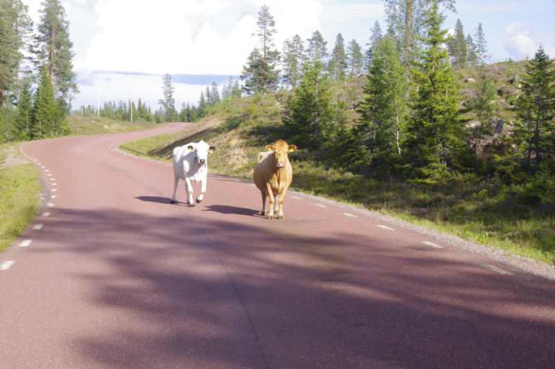| Erst ein Schild, das auf Kühe hinweist und dann wirklich ein Rudel Kühe - sehr geländegängig | das sieht nur gefährlich aus. Die schauen nur so, weil sie wohl noch kein Radfahrer in ihrem Leben gesehen haben |