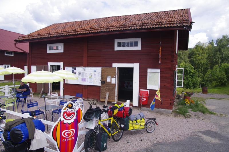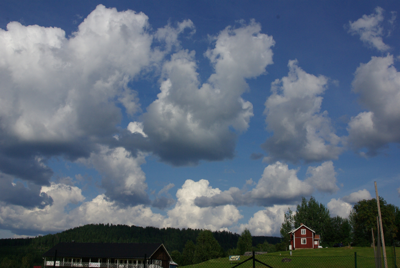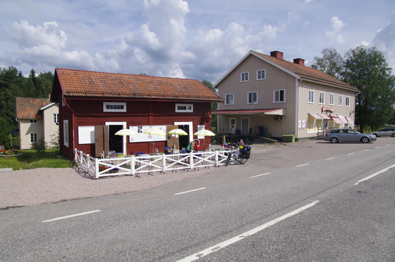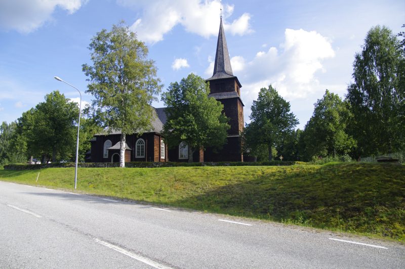 | Wieder eine komplette hölzerne Kirche am Wegesrand Riesige Haufenwolken | Wenige Kilometer trennen uns noch von der Grenze zu Norwegen. Eine Elchkuh steht dann einige Meter abseits im lichten Wald rechts neben der Straße. Sie sieht uns, Radfahrer kennt sie wohl nicht, und ergreift die Flucht. Ab durch den Fluß und weg war sie. Das letzte Cafe vor Grenze -schade- geschlossen |