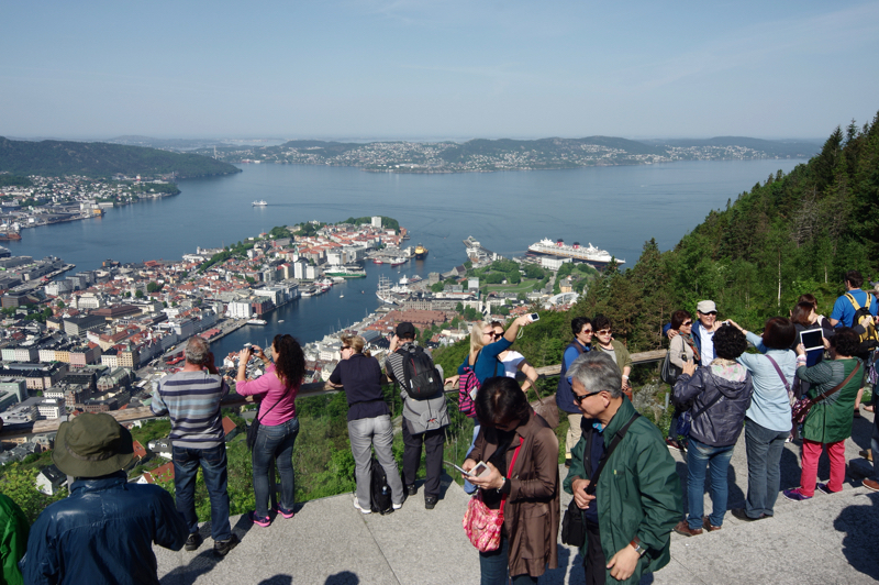 Bryggen ist später überbevölkert, wie auch der Fischmarkt. Aber vom Fischmarkt bin ich enttäuscht. Nur noch sehr klein, viel abgepacktes und irgendwie kein Fischmarkt mehr, wie vor 20 Jahren. An jeder Ecke kann man Essen bekommen. Aber die Preise ganz schön hoch. An einem Bankautomaten ziehe ich mir erstmal NOK, damit ich mir mal nen Cafe oder zwei und Kuchen kaufen kann. In einem Cafe, so like Starbucks kostet mir der Muffin und der große Cappu gut 8 €. Ich schreibe hier des öfteren mal so über Preise, einfach mal so zur Information. Es ist einfach gesagt, doch ganz schön teuer geworden, bzw. die Norweger verdienen/bekommen einfach mehr Geld. Ich sehe hier auch viele junge Leute, die hier verkehren. Aus dem Fenster beobachte ich den Fahrradstand mit Rädern zum ausleihen. Ich sehe es mir an, wie gerade ein Mann mit Schlips und Kragen sich ein Rad „zieht“. Er spricht mich an und ich sage ihm das ich kein norwegisch kann, komme aus Deutschland. „Macht nichts, dann können wir Deutsch sprechen“ wurde entgegnet. Die Räder können per app gesucht werden und „abgekoppelt“ werden. Man kann die Stationen sehen, wo es noch wie viel Räder gibt. Zur Zeit alles umsonst, wegen dem Musikfestifal. Die Räder werden viel von Kindern genutzt, die natürlich, wie soll es sein, auch hier ein Smartphone haben. ![]() Zwischenzeitlich haben sich die Wolken doch ganz schön verzogen, die Sonne hat richtig "Kraft" und zieht den Meschen förmlich die dicken Jacken aus. Es ist nicht warm, sondern eher heiß. Ich verlasse das Centrum und gehe durch kleine Gassen in Richtung Aussenbereich von Bergen. ![]() An einem großen See, der Store Lungegardsvann ist dieses Jahr der Stellplatz für ein Holzfestifal. Auch der Nordseeküstenradweg führt hier recht breit und sehr gut ausgebaut vorbei. Haugesund, auch ein Ort, den ich besuchen werde. ![]() Alles aus Holz aus Teams aus verschiedenen Ländern. ![]() ![]() ![]() ![]() Die Strecke an diesem See ist stark belaufen. Junge Männer und Frauen machen hier richtig Power. Sogar die Leihräder tauchen hier auf. ![]() Der breite, zweispurige Radweg ist gut ausgeschildert und zeigt mir, das Haugesund minimal 162 Kilometer entfernt ist. In ein paar Sachen erkenne ich in der Stadt ja wieder, aber es ist sehr viel umgebaut worden und es wird überall weiter gebaut. Im direkten Centrum sind dabei die Radwege etwas kurz gekommen wegen dem fehlenden Platz, aber auf vielen Zufahrtsstraßen sind schöne breite Radwege, meist extra geführt gebaut worden. Da sind auch viele Radler unterwegs. In einer ruhigen Nebenstaße mache ich bei einem Straßenkaffee Pause und relaxe in der Sonne. Touristen, eher ganz, ganz wenig. Okay mindestens einer. Die fallen immer mit den Kameras auf. Ich trage sie deshalb immer locker in der Hand und nicht am Riemen um den Hals. Am späten Nachmittag gehe ich dann langsam wieder durch kleinste Seitenstraßen, teilweise nur Stufen zwischen den Häusern in Richtung meiner Unterkunft. Pünktlich, wie abgesprochen bin ich um 17 Uhr dort. Jan macht Abendessen. Draußen sah ich schon den Grill glühen. Gegen 18.00 Uhr Essen wir gemeinsam draußen auf der Terasse. Lachsforelle mit Tymian in Alufolie gegart. Dazu Tomatensalat und Reis. Danach den obligaten Espresso und anschließend fuhren Jan und Helle nochmals zur Mutter ins Krankenhaus. Ich war nun alleine im großen Haus. Sitze auf der Terasse und schreibe den Bericht. Bilder bearbeiten kommt später, da viel zu hell. Jetzt, so gg 20 Uhr bewölkt es sich zusehends, man sieht die Sonne noch dünn durchscheinen und bis es richtig dunkel wird, dauert es noch. Ich habe heute meine Strecke geloggt und bin doch wirklich 16 Kilometer gegangen. Ein paar Bilder vom Fischmarkt. Nichts mehr besonderes, teuer, das sagen sogar die Norweger. ![]() ![]() ![]() ![]() Freitag, 3.6.2016 Wieder früh aufstehen und Frühstück mit Helle. Danach wird das Rad bepackt. Wieder gutes Wetter. Die Sonne scheint vom wolkenlosen Himmel. Jan macht noch Bilder von mir und dann düse ich wenige Kilometer in Richtg Marie, ein weiterer Platz von Warmshowers. Es geht wieder gut aufwärts aber auch steil abwärts, die Bremsen dürfen hier alles, nur nicht versagen. Marie ist auf Arbeit, aber das Haus ist offen von oben bis unten. ![]() Sie hat es mir gemailt. Sieht schon ein bisschen wild aus. Ich packe ab und gehe Richtung Floyenbanen. Es ist noch früh und ich hoffe auf keine Warteschlange. Voll daneben getippt. Wo kommen die alle her und warum wollen die da alle vor mir hoch? Nee! Auf keinen Fall. Dieser Massentourismus. ![]() Google hilft, -Floyenbanen ticket- Ticket ruckzuck übers Internet gebucht und bezahlt, mail mit Barcode erhalten und vorbei an der Schlange. Schwupp war ich oben. ![]() ![]() ![]() ![]() und wenn einem dann richtig heiß ist, gibt es Anzugserleichterung und schnell die mails checken ![]() Hier oben trifft sich die Welt. Einheimische eher selten, die sind dann an den Laufklamotten zu erkennen. Die rennen hier hoch, sitzen kurz da und ab geht es wieder runter. Eine Truppe Biker, von jung bis ... mit E-Bikes kommen von TUI Tours. Da radele ich doch lieber nur zu zweit, oder wie jetzt alleine. Ich genieße hier oben den Café mit Apfelkuchen und schaue mir Bergen in Ruhe von oben an. Bei solch einem Wetter muss man das genießen. Die Bahn ist neu und ich bin überrascht wie schnell sie ist. Drei Minuten, gemessen, eine Strecke. Menschen auf der einen Seite raus, die neuen steigen von der anderen Seite ein. Am großen Display kann man sehen, wieviel Plätze noch da frei sind, oder ob man gleich Halt machen kann. In den 90ern ging das noch langsam vonstatten und mit weniger Touris. Jetzt werden die Touris im 10 Minutentakt rausgeworfen. Irgendwann ist der Aussichtspunkt ausgeguckt. Drei Minuten und man ist unten, oder halt oben. ![]() Hier kommt eine Bahn hoch gefahren
