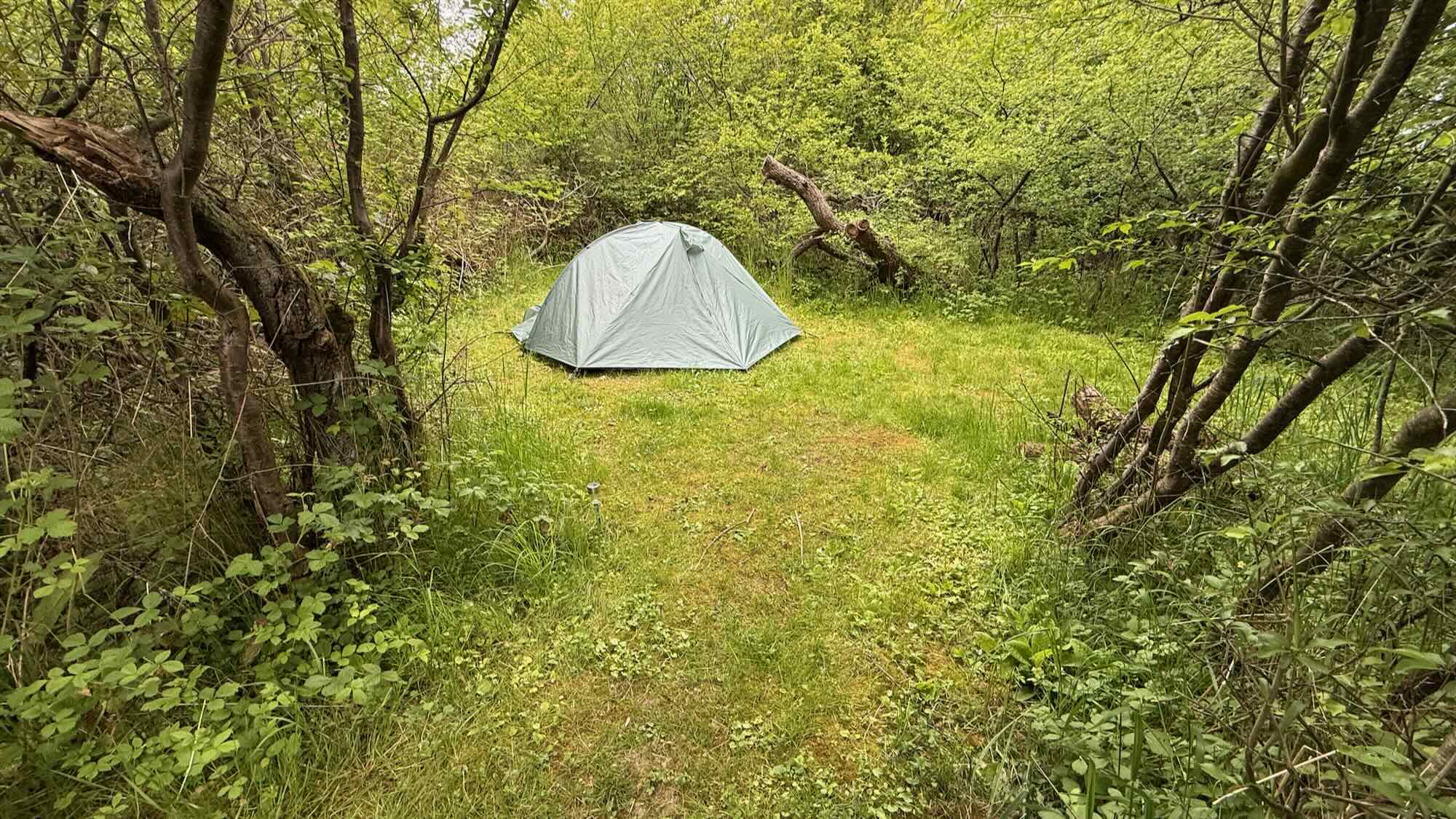 Ich habe das Zelt aufgebaut auf Platz 1 in der Ecke und werde jetzt zum nächsten Ort Årsdale gehen.