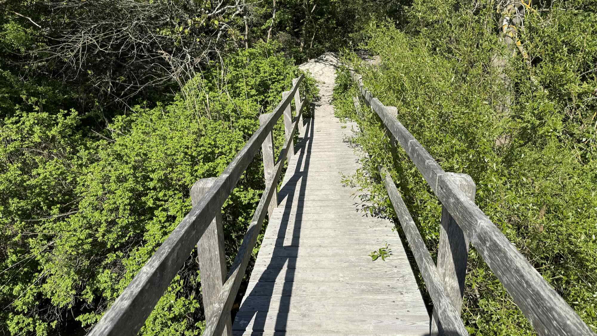 kleine Holzbrücke überquert einen Fluss neben