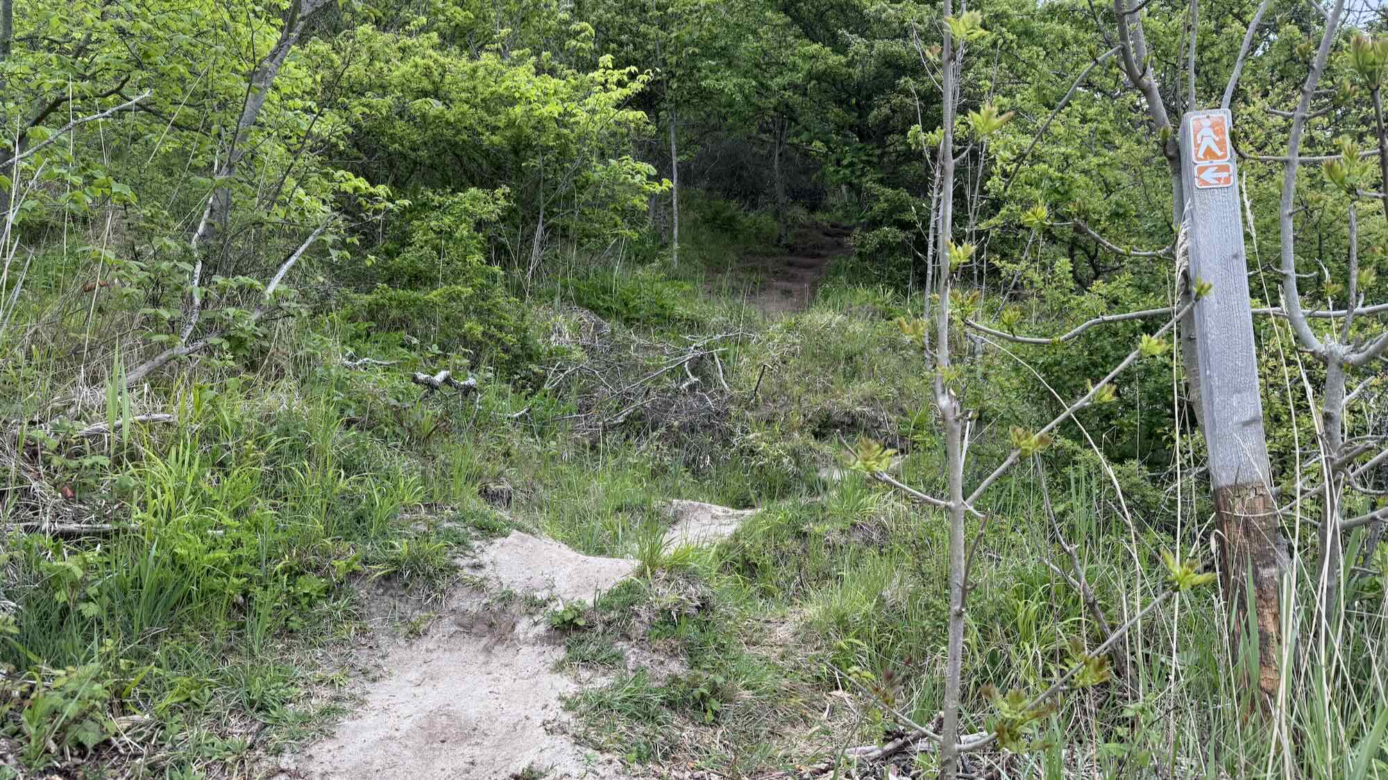 Der Weg geht rechts hoch in den Wald